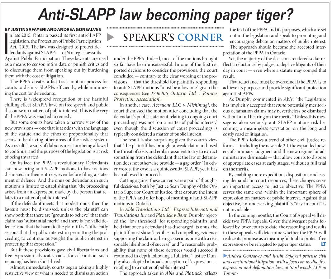• Moderator (panel on anti-SLAPP cases), Ontario Bar Association’s “Defamation Law:  A Practical Guide for Litigators” (May 14, 2019)